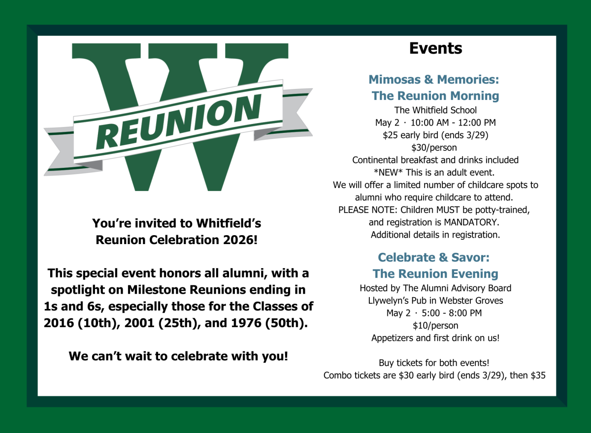 This special event honors all alumni, with a spotlight on classes ending in 1s and 6s. Join us as we celebrate Milestone Reunions for the Classes of 2016 (10th), 2001 (25th), and 1976 (50th). Reconnect with classmates, relive cherished memories, and make new ones as we come together to celebrate your Whitfield legacy.