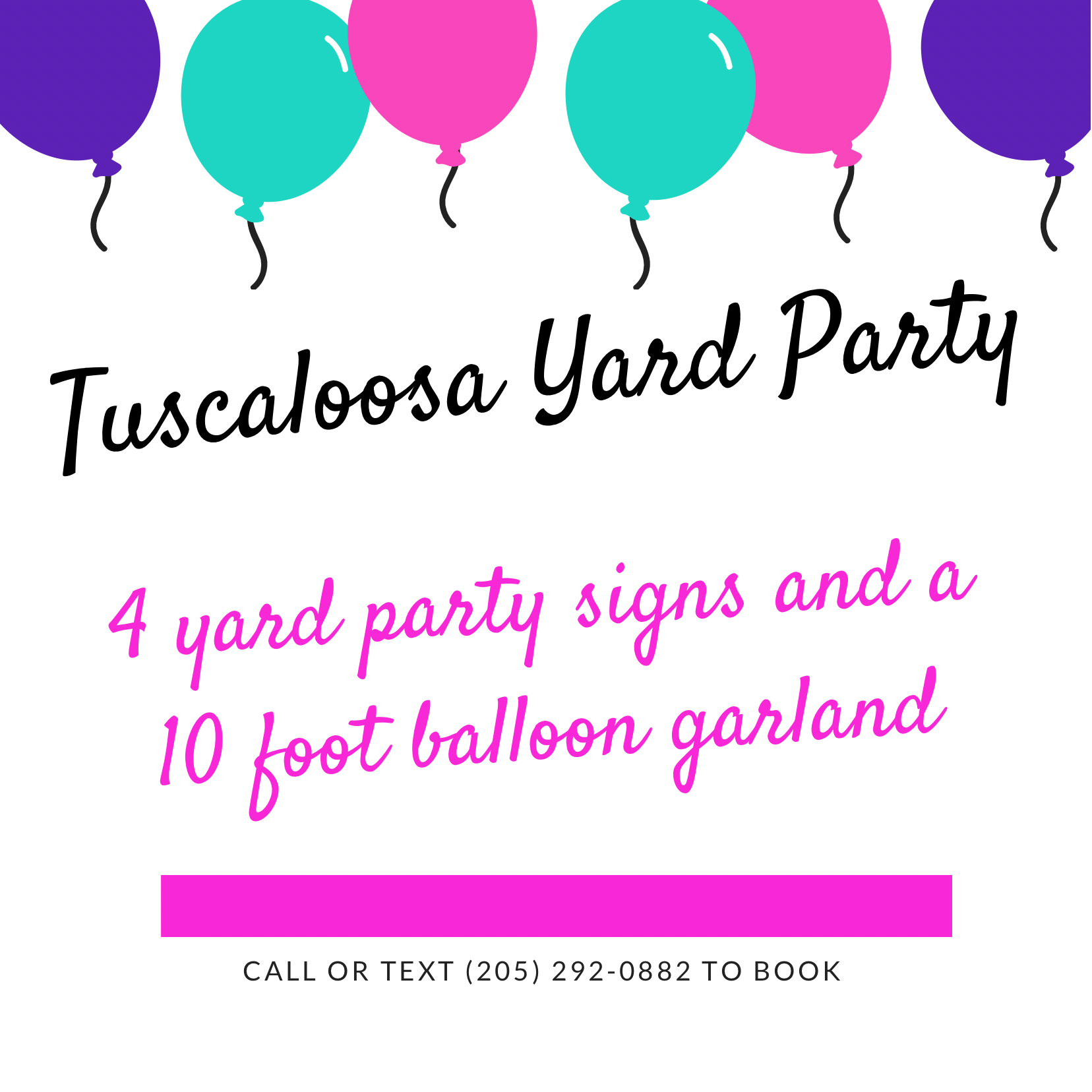 Package includes custom cake by Baked by Emmy, Tuscaloosa Yard Party 4 yard signs and 10ft balloon garland, a custom 6-7 foot banner from Last Word Lettering, and $50 gift card to the Venue (equivalent to one scoop of ice-cream from Liza's for up to 20 children).